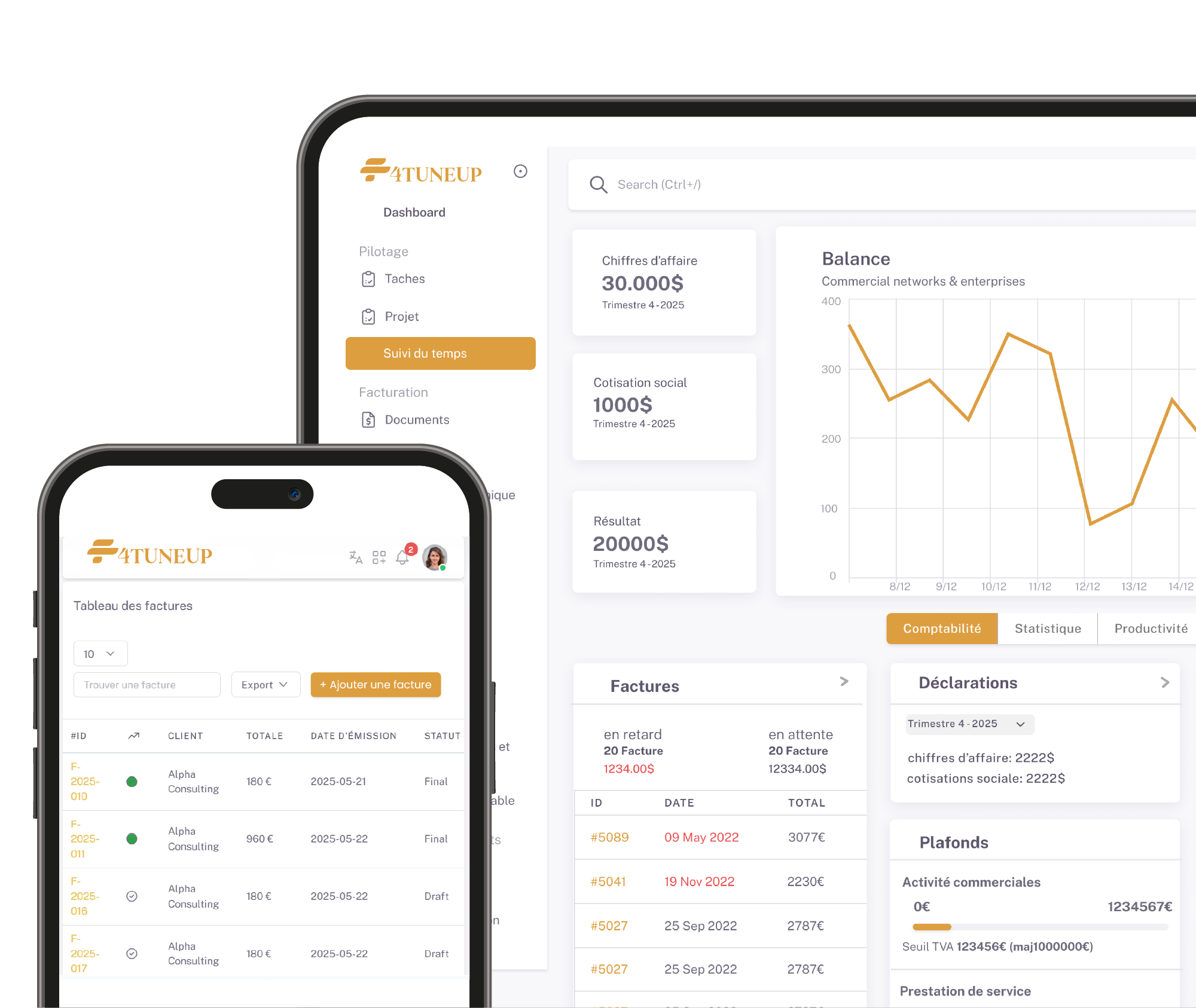 Que vous soyez une petite entreprise ou une organisation établie, 4TuneUp propose des options flexibles et transparentes pour gérer votre facturation, comptabilité et projets efficacement.