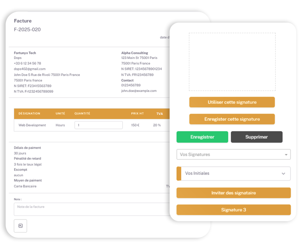 Faites signer vos devis et factures en ligne en quelques clics. Garantissez la conformité légale et un processus professionnel.